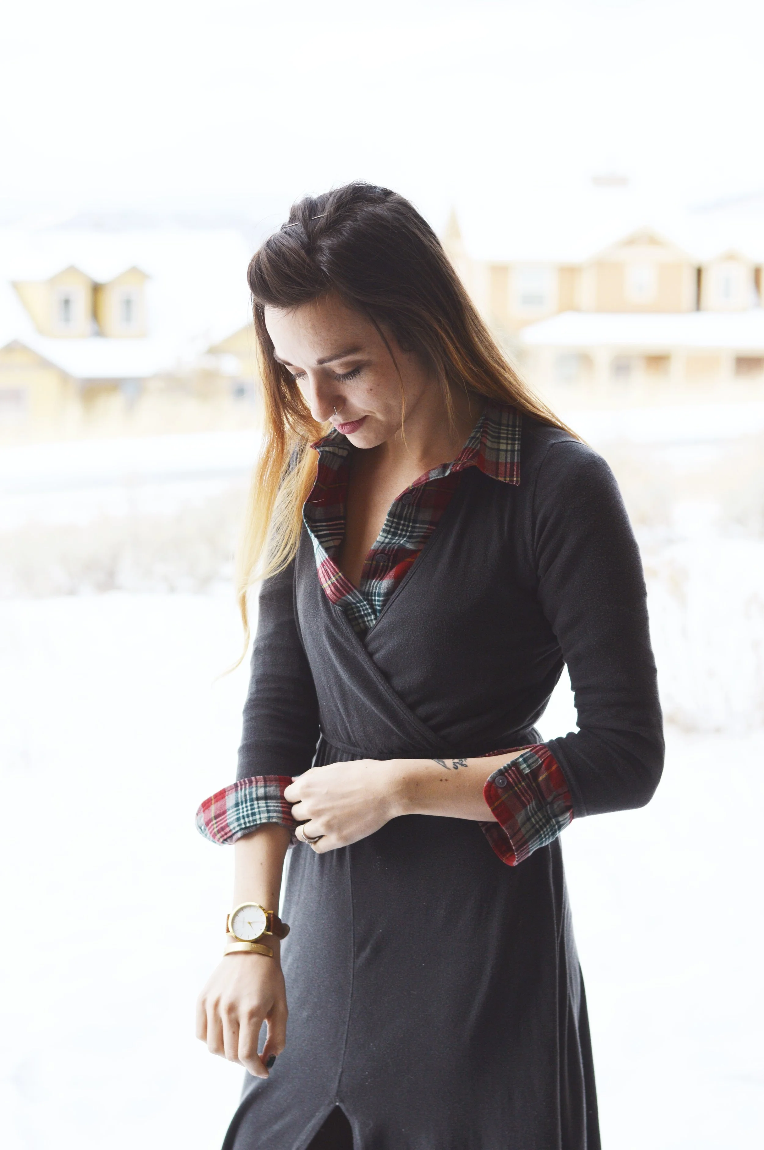 Although it's a fairly form fitting dress, I've loved layering collard shirts underneath for Dressember, for an added layer of warmth. However, the dress can easily stand on it's own, and has a longer slit in the front and a deep v-neck with a faux-wrap in the front. Most importantly, it's so comfortable.