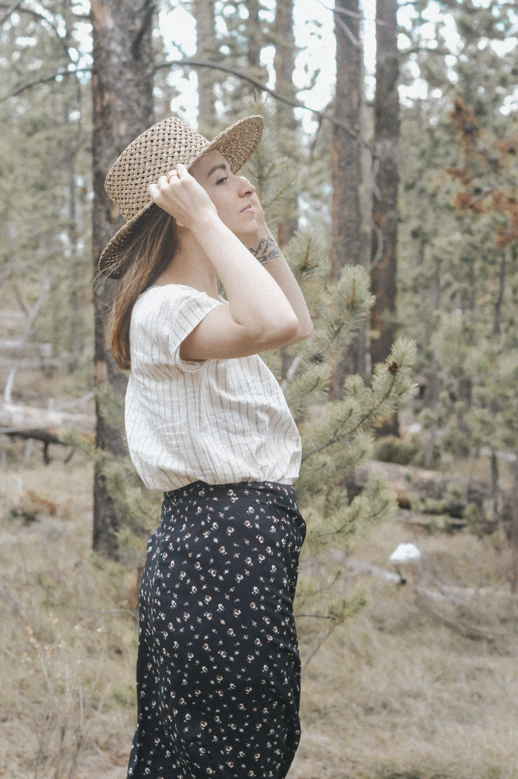 Although today I’m wearing jeans, my Pamut Apparel Simone Top from last summer, a cozy cardigan and slippers, the day I shot these photos wasn’t any more special or busy than this rainy, moody Monday. When I shot my new Pamut Hanna Top though, I felt like pattern mixing, and channeling a beach vacation with my thrifted Friends of Friends sunhat and thrifted skirt. The sun was shining, we spent the day outside working on Aj’s newest project with a glass of wine in hand, and it was glorious.